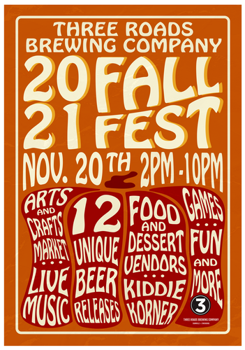 Join Three Roads Brewing Company for the Inaugural 2021 Fall Fest on November 20th! We'll have an arts and crafts market, live music, food and dessert vendors, a kiddie korner, games, and the release of 12 unique beers!